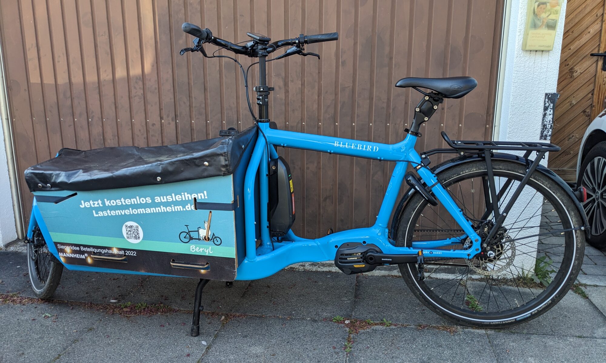 Beryl ist ein zweirädriges Lastenrad mit einem Vorderkorb vom Hersteller Bullit. Es hat eine elektrische Motorunterstützung und ist sehr wendig, Eine Sattelstütze mit super Federung ist montiert, es können zwei Kinder (ca. 1,5 – 6 Jahre) angeschnallt werden.